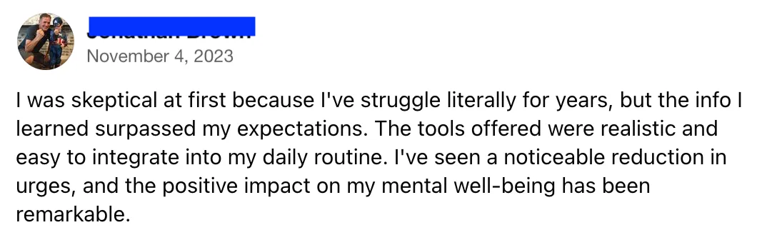 Implement the tools that you'll learn and watch as your progress and ability to overcome urges skyrocket.